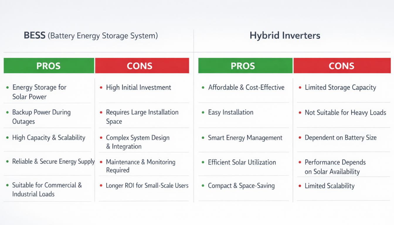 BESS is better for big energy needs because it can grow easily. Hybrid inverters work well for small places, saving energy and reducing waste. This shows how each system fits different needs.