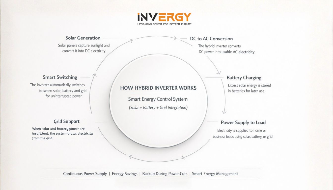 Hybrid inverters use smart energy management systems to automatically decide whether to use solar power, battery storage, or grid electricity based on availability and demand.